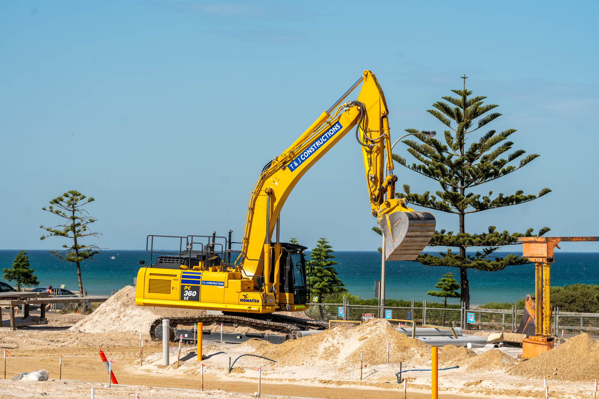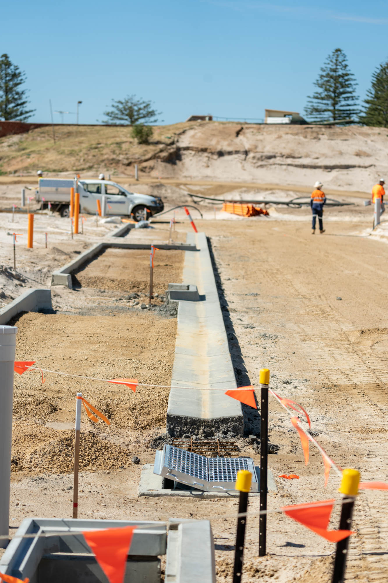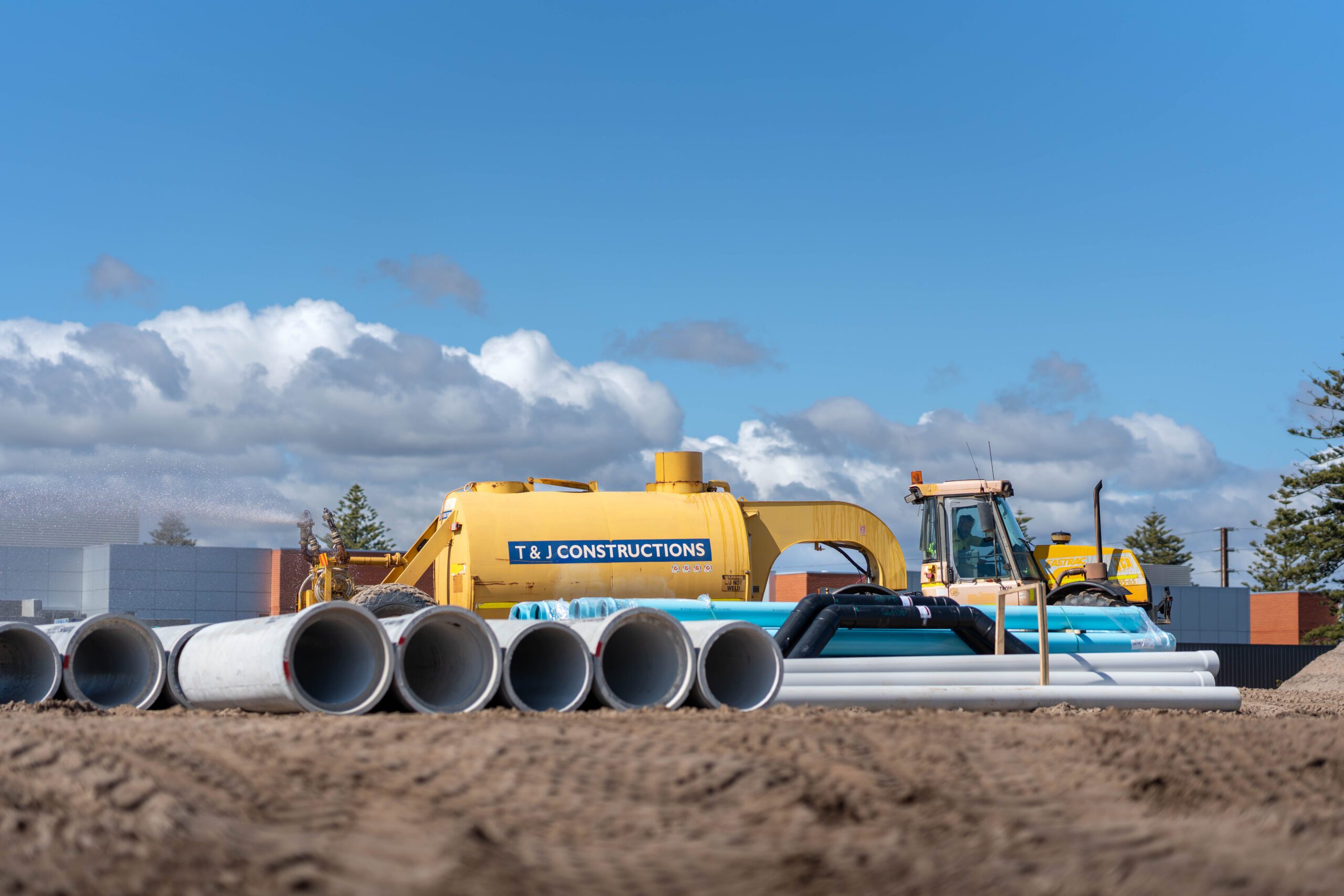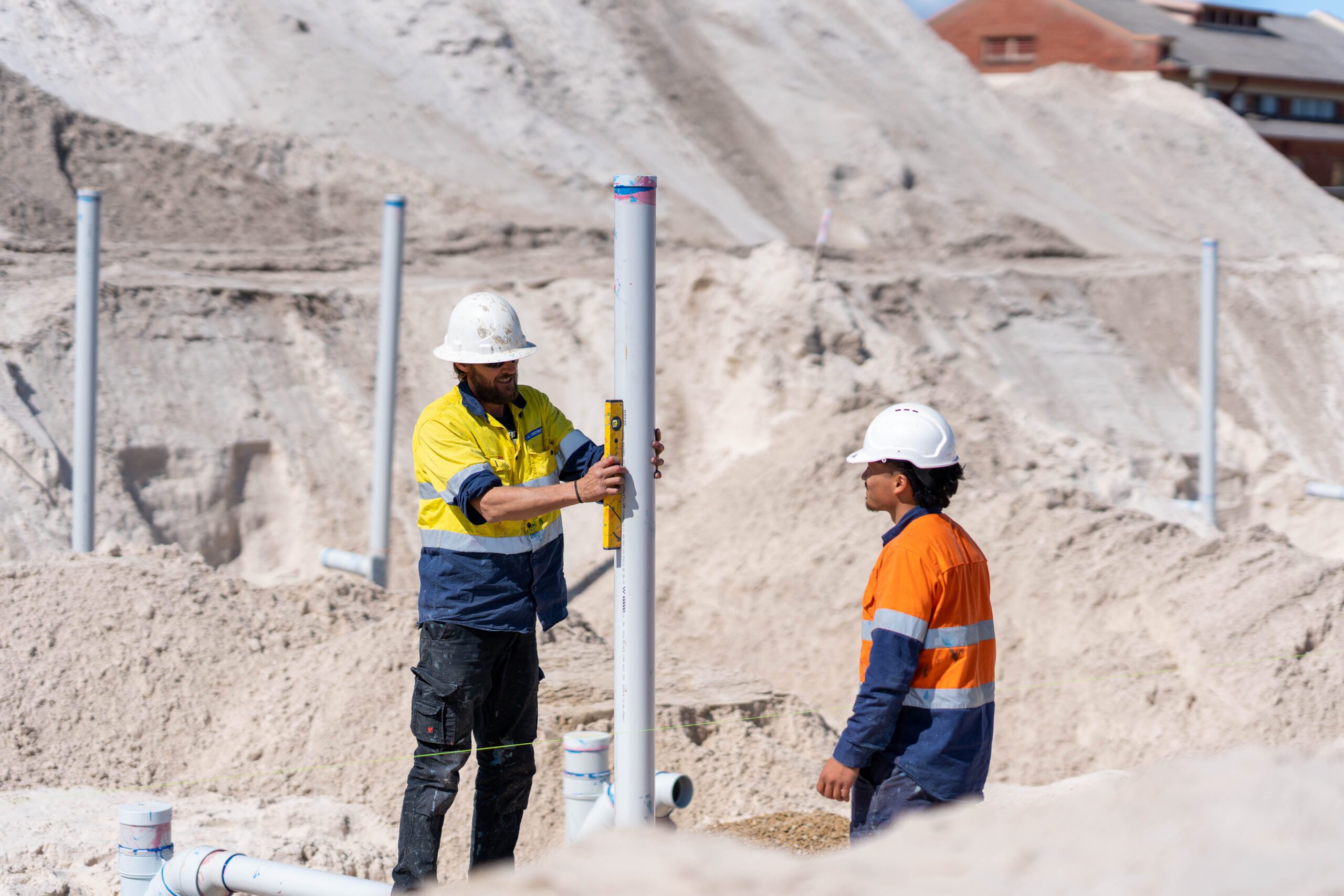 - Due to the sand the sewer pipe required more protection, geofabric was placed on the pipe bed and ran up the sides of the trench. Once the pipe was laid and backfilled the geofab was folded over the top to wrap it like a present, protecting the pipe for as much sand as possible – this method was used for the entire project.